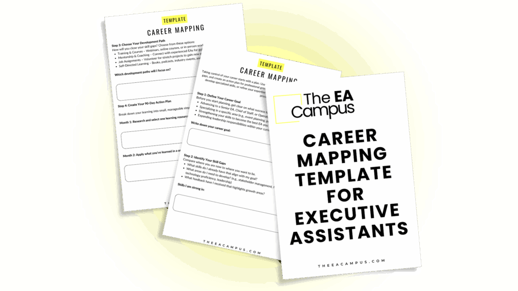 We know that every EA’s journey is unique. Some want to become a Senior EA or Chief of Staff, while others want to specialize in event management, technology, or project management. With this template, you’ll get the clarity you need to define your personal vision for success.